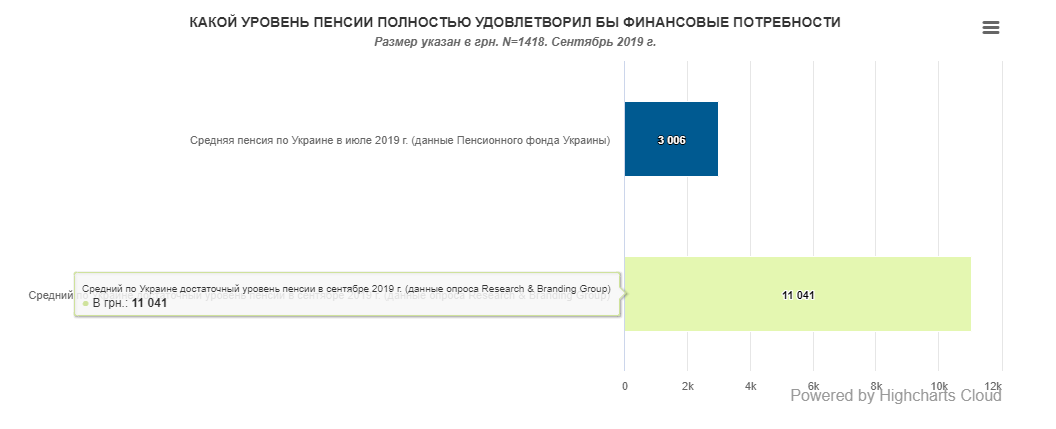 Опрошенные пенсионеры считают, что размер пенсии в Украине должен составлять 11041 гривен. Только тогда ее хватит для удовлетворения всех финансовых потребностей, считают они. Таким образом, официальный размер пенсии меньше почти в четыре раза, чем желаемый.