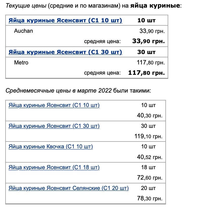 В то же время лет куриных яиц (30 шт) "Ясенсвет С1" стоит 117,80 грн, тогда как средняя цена в марте - 119,10 грн.