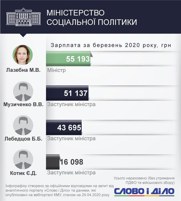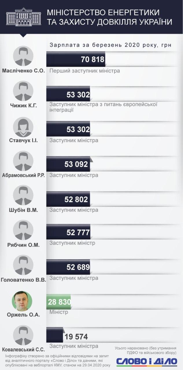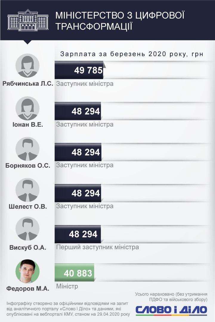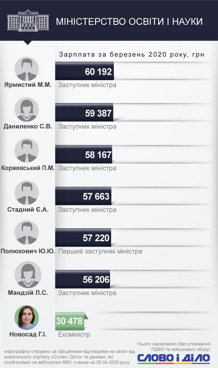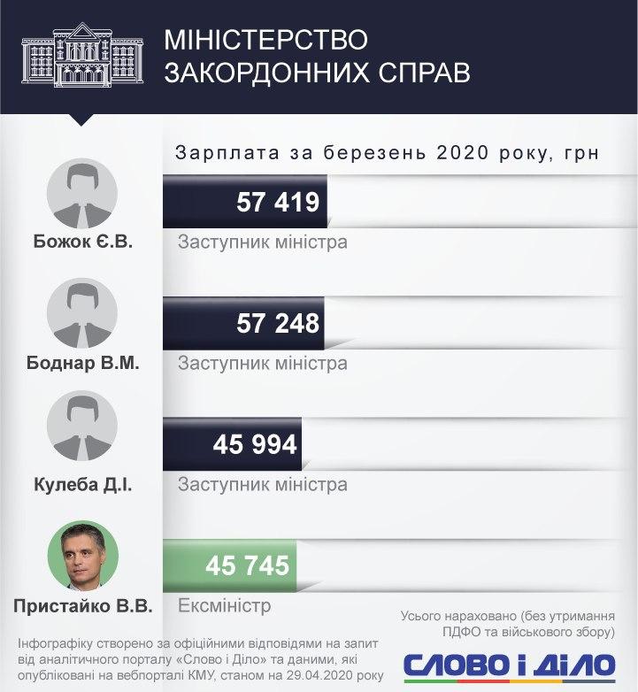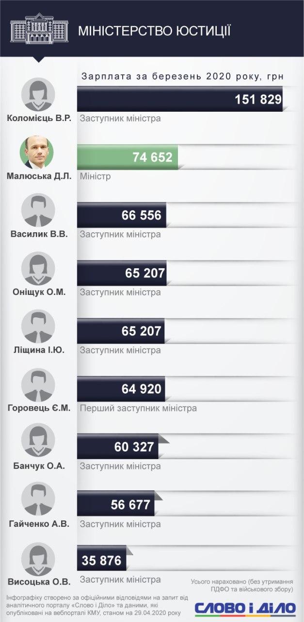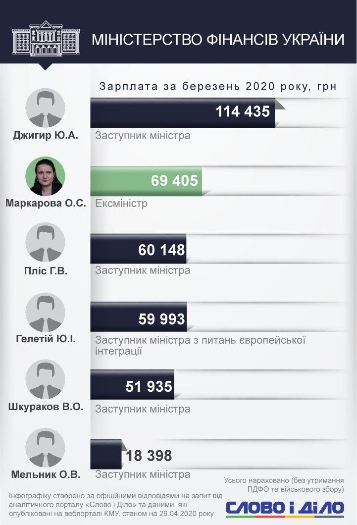 Среди заместителей министров самым высокооплачиваемым стал Иван Руснак с Минобороны - 161,9 тыс. грн. Юрий Джигир из Министерства финансов получил в марте 114,4 тыс. грн, Наталья Форсюк из Министерства инфраструктуры - 113,4 тыс. грн, Валерия Коломиец из Минюста - 151,8 тыс. грн.