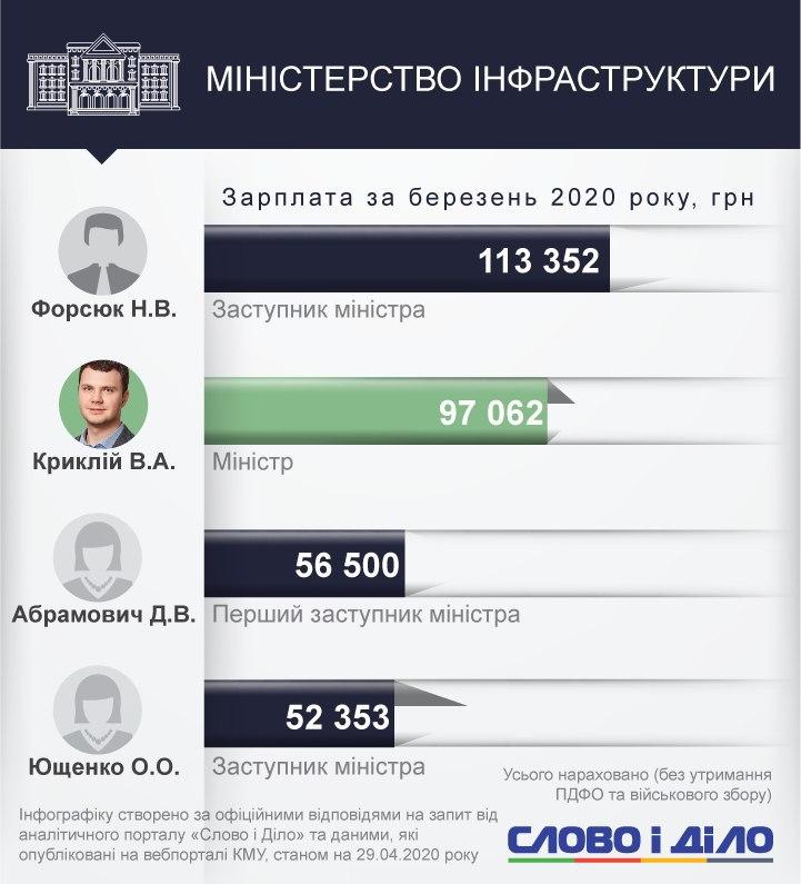 Владислав Криклий заработал 97,1 тыс. грн. На втором месте - министр юстиции Денис Малюска - 74,7 тыс. грн, на третьем - уже бывший министр финансов Оксана Маркарова (69,4 тыс. грн). В первую пятерку также вошли министр обороны Андрей Таран и министр социальной политики Марина Лазебная.