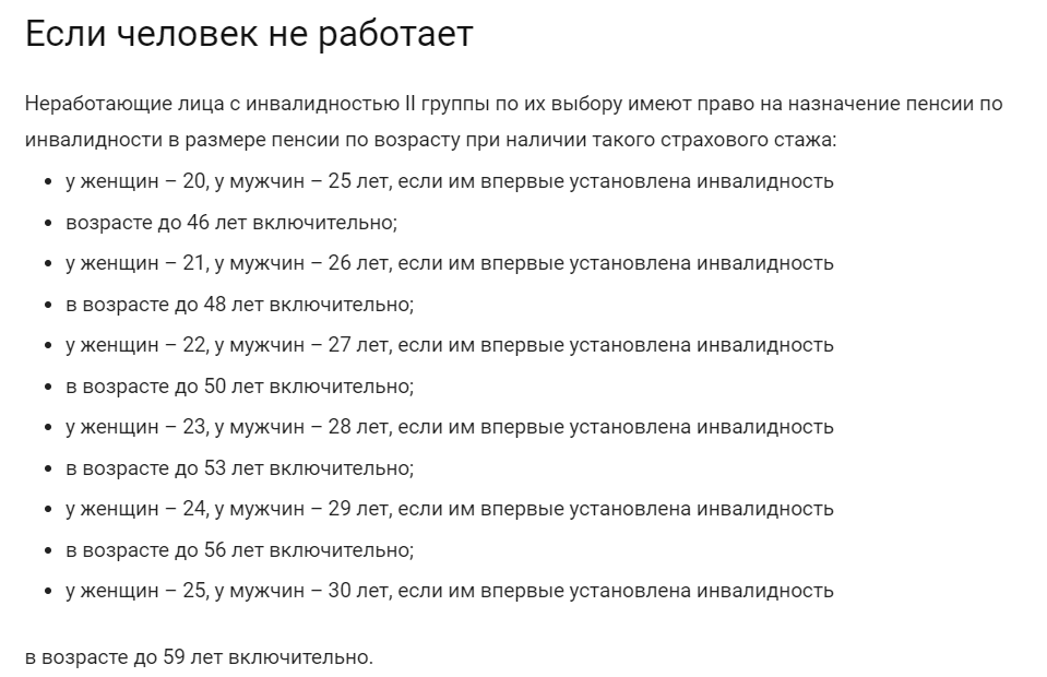 Неработающие лица с инвалидностью II группы, которые были признаны лицами с инвалидностью после достижения пенсионного возраста, и лицами с инвалидностью III группы, по их выбору имеют право на назначение пенсии по инвалидности в размере пенсии по возрасту при наличии страхового стажа у мужчин – 35, у женщин – 30 лет.