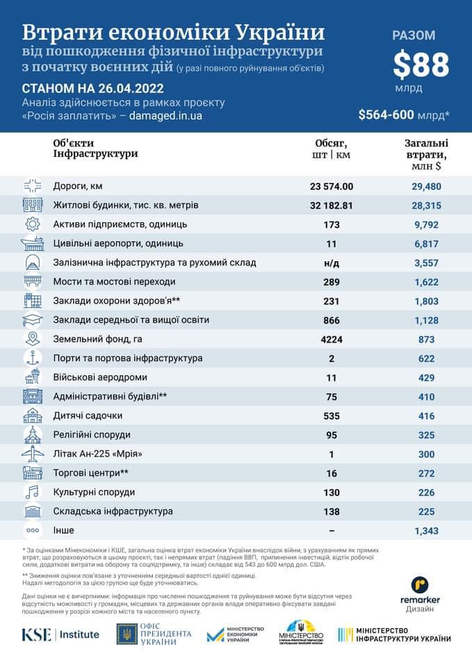 В ходе войны с российскими оккупантами, по состоянию на 26 апреля, прямые потери инфраструктуры Украины достигли более 88 млрд долларов. Общие экономические потери нашей страны достигают 600 млрд долларов.