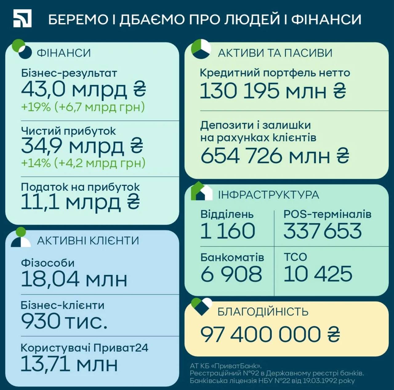 По данным финучреждения, объем чистого кредитного портфеля банка вырос на 17,4 млрд грн и превысил 130 млрд грн. Это также свидетельствует о постоянной поддержке бизнеса и физлиц по всей Украине.