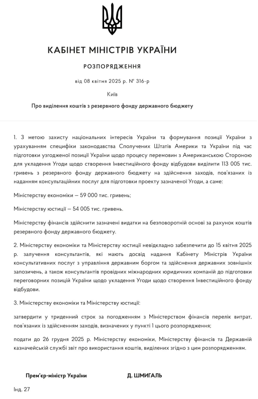 Согласно распоряжению №316-р "О выделении средств из резервного фонда государственного бюджета", датированном 8 апреля 2025 года, средства получат консультанты. Эксперты будут привлечены для подготовки проекта договора, который будет учитывать специфику законодательства Украины и Соединенных Штатов.