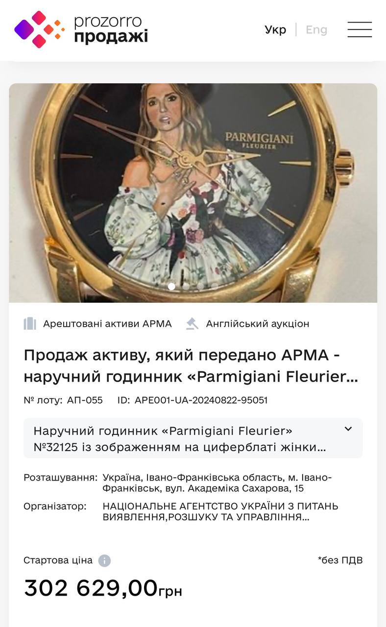 "Конфискованную у Медведчука коллекцию часов выставили на онлайн аукцион Prozorro. Теперь у вас есть возможность купить часы с портретом Оксаны Марченко. Стартовая цена всего 300 тыс. грн. Налетай! Вот на что шли деньги российских налогоплательщиков", - написал он в Telegram.