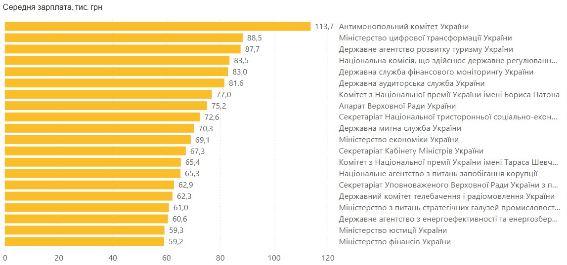 - Антимонопольный комитет (в среднем ее работники получают зарплату 113,7 тысячи гривен);
