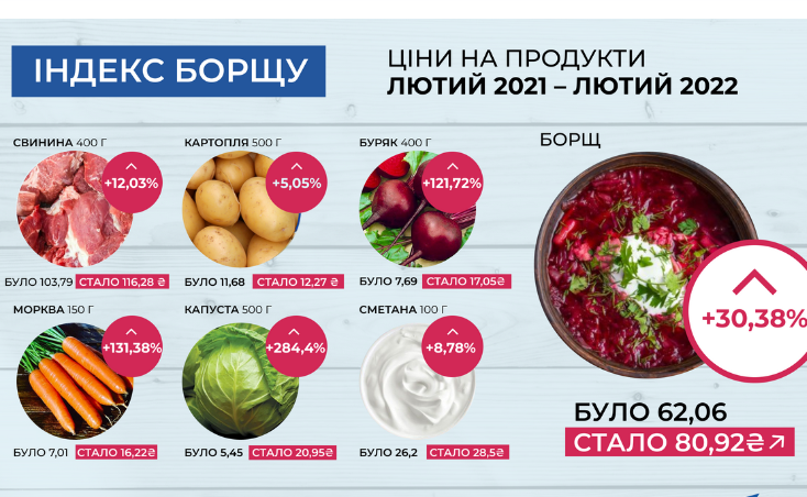 По экспертным подсчетам, в феврале 2022 года борщ на четырех человек по традиционному рецепту стоит 80,92 гривны. Год назад его можно было приготовить за 62,06 гривны.