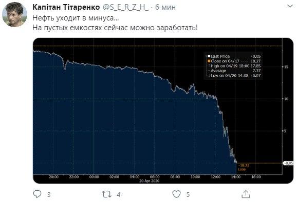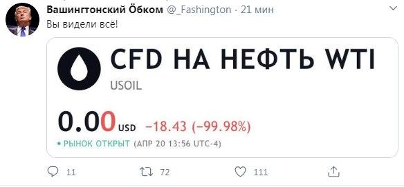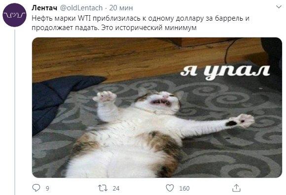 Рекордное падение цены нефти WTI, стоимость которой с поставкой в мае опустилась до нуля, а с поставкою в июне торгуется в минусовых значениях, вызвало бурную реакцию пользователей сети.