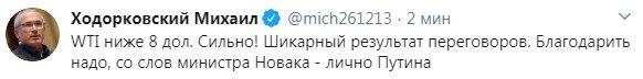 Отреагировал на ситуацию оппозиционный российский политик Михаил Ходорковский. "WTI ниже 8 долларов. Сильно. Шикарный результат переговоров. Благодарить надо, со слов министра Новака - лично Путина", - написал он.