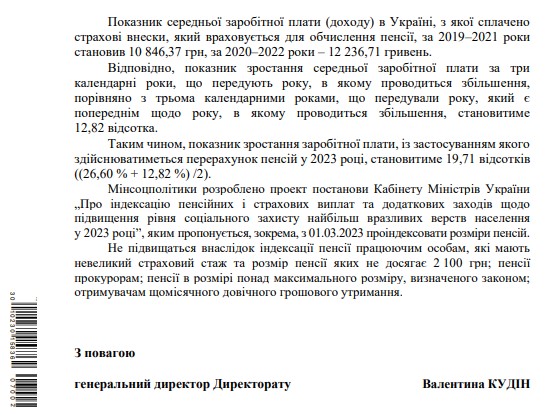Отмечается, что Минсоцполитики разработан проект постановления Кабинета Министров Украины "Об индексации пенсионных и страховых выплат и дополнительных мер по повышению уровня социальной защиты наиболее уязвимых слоев населения в 2023 году", которым предлагается, в частности, с 01.03.2023 проиндексировать размеры пенсий.