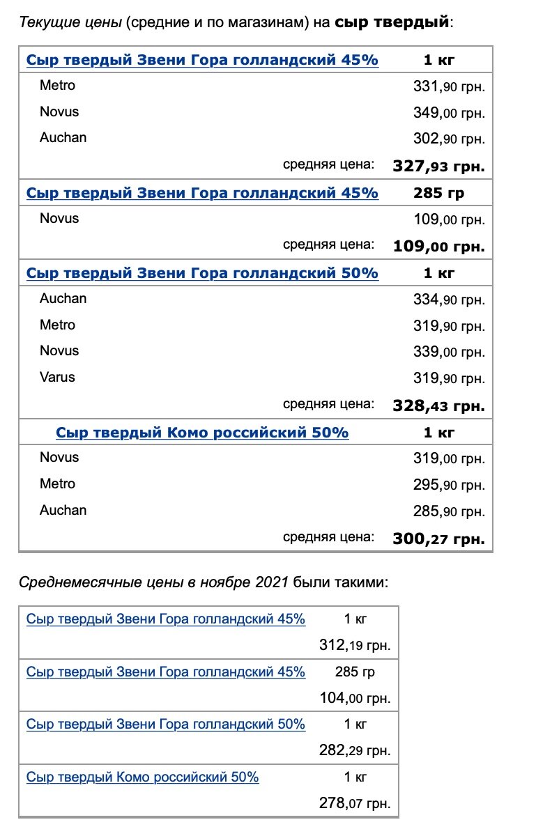 Также выросла стоимость твердые сыры. Килограмм сыра "Звени Гора голландский 45%" теперь стоит 327,93 гривны, что на 5% дороже ноябрьской цены. А почти такой же сыр "Звени Гора голландский 50%" сейчас стоит 328,43 гривны. Это дороже чем в прошлом месяце на 16%. Вырос в цене и сыр "Комо российский 50%" (на 8%), который теперь продают по 300,27 гривны.