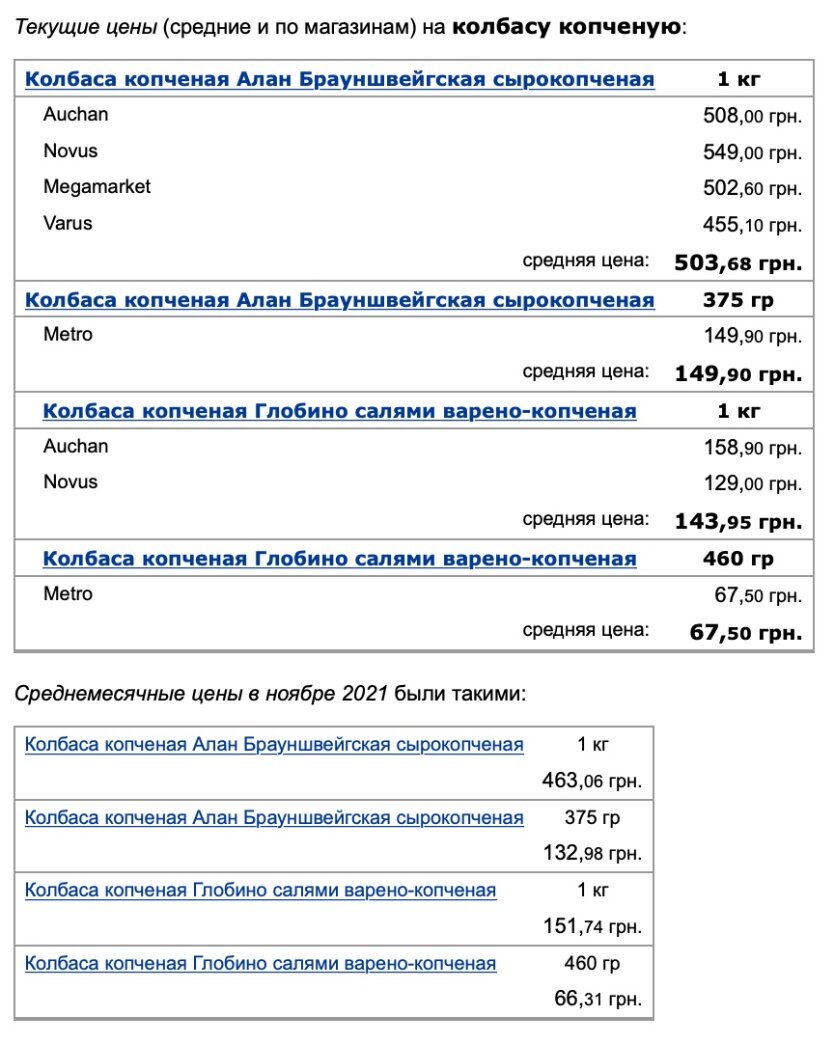 Однако в отделе с колбасными изделиями высшей ценовой категории ситуация прямо противоположная – там стоимость возросла. В частности, стоимость килограмма сырокопченой колбасы "Алан Брауншвейгская" в ноябре была 463,06 гривны, а сейчас – 503,68 гривны. А за небольшую палку такой колбасы весом в 375 граммов в ноябре пришлось бы отдать 132,98 грн, сейчас же она стоит 149,90 гривны. Таким образом, по сравнению с ноябрем цена на колбасу этого сорта выросла на 8,7%.