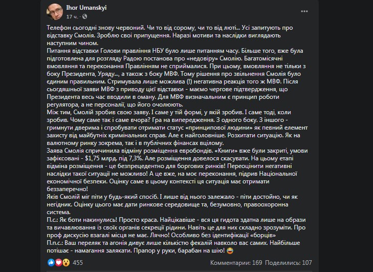 "Это попытка расшатать ситуацию. Как на валютном рынке в частности, так и в публичных финансах в целом. Заявление Смолия вызвало отмену размещения евробондов. "Книги" уже были закрыты, условия зафиксированы - $1,75 млрд под 7,3%. Но размещение пришлось отменить. На этом этапе отмена размещения - это беспрецедентно для долговых рынков! Переоценить негативные последствия такой ситуации невозможно. А это уже, по моему убеждению, подрыв национальной экономической безопасности", - написал Игорь Уманский.