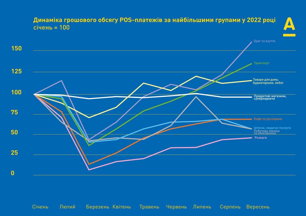 Самым выдающимся явлением сентября был скачок расходов украинцев на одежду и обувь, который составил 28% в месяц. Очевидно, традиционный сезонный переход в этом сегменте был значительно усилен холодной и дождливой погодой, заставившей многих рано прибегнуть к обновлению осенне-зимнего гардероба. Средний чек покупки в торговых точках вырос на 15% и превысил 1200 грн.