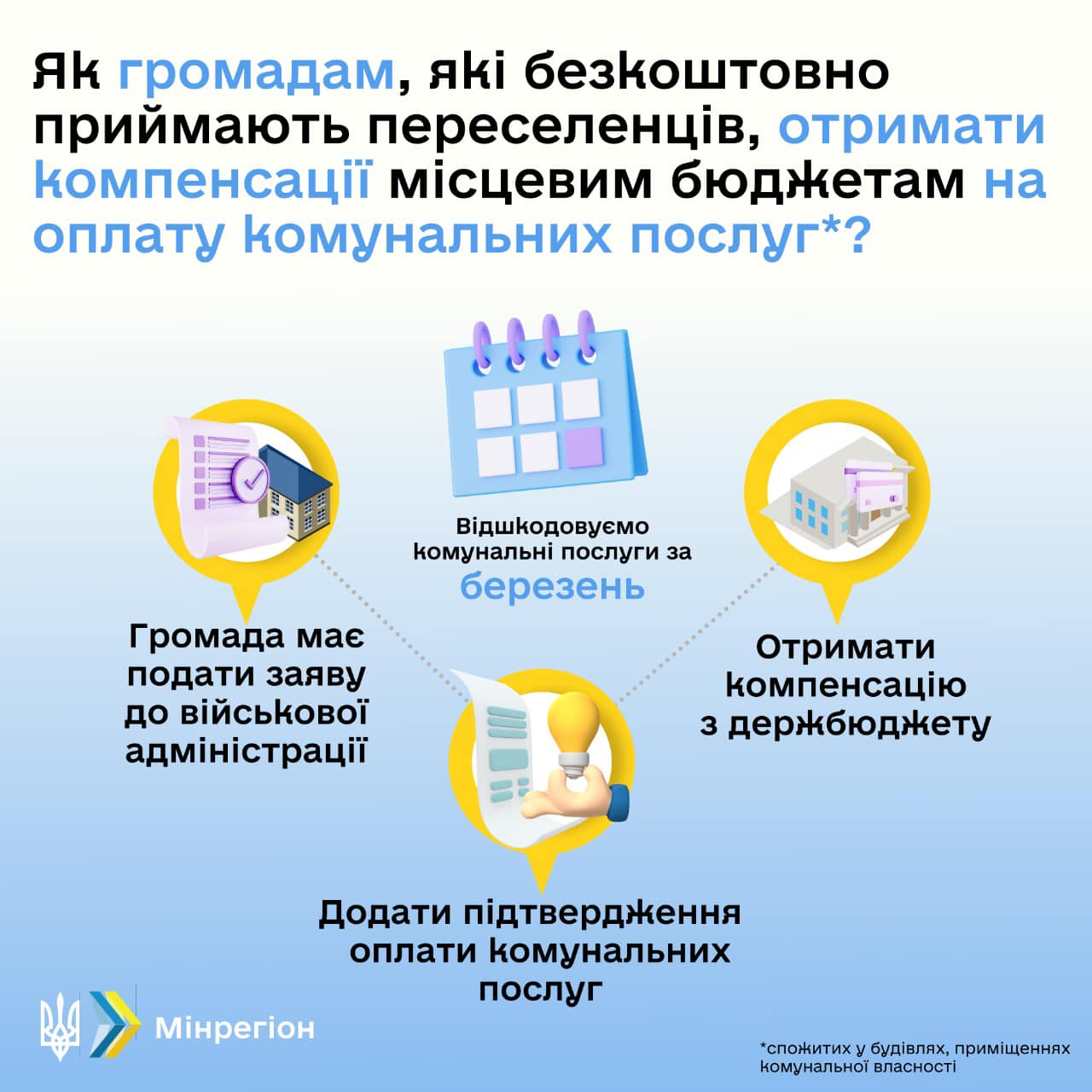 Возмещаться будут расходы на коммунальные услуги, предоставленные с 1 марта. То есть в начале апреля общины смогут подавать свои заявки на возмещение.