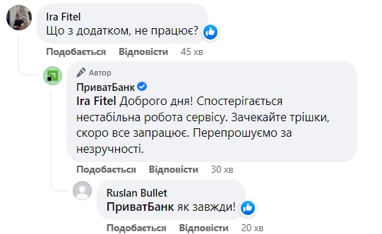 На вопросы недовольных клиентов в ПриватБанке ответили, что сейчас "наблюдается нестабильная работа сервиса", нужно немного подождать, и "скоро все заработает".