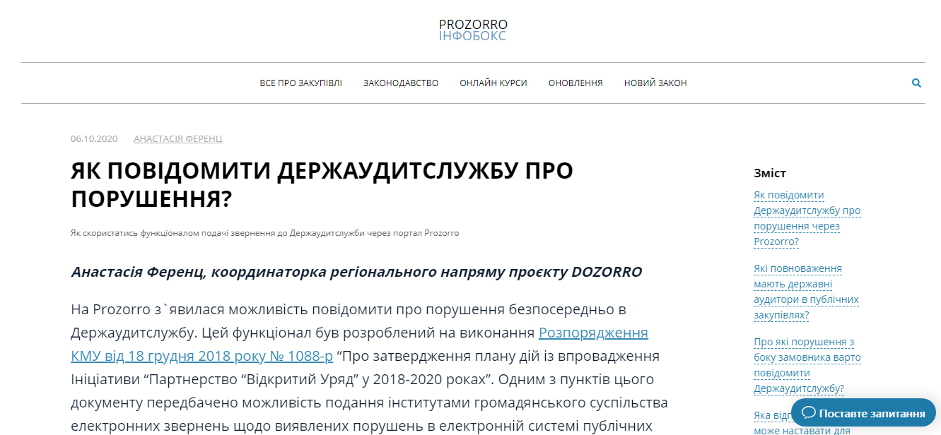 На сайте "Prozorro Инфобокс" появилась возможность сообщить о нарушении в Госаудитслужбу через страницу закупки на портале Prozorro, однако в Госаудитслужбе заявили, что не имеют к этому отношения.