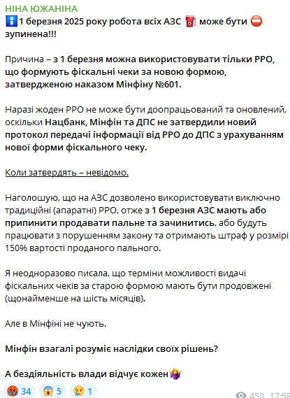 "1 марта 2025 года работа всех АЗС может быть остановлена. В настоящее время ни один РРО не может быть доработан и обновлен, поскольку Нацбанк, Минфин и ГНС не утвердили новый протокол передачи информации от РРО к ГНС с учетом новой формы фискального чека", - написала Южанина.