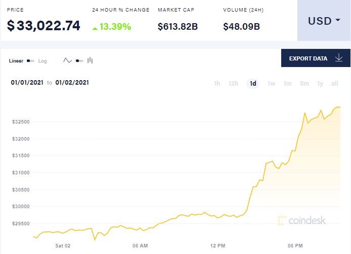 В ходе сегодняшних торгов, 2 января, курс биткоина вырос более чем на 13% и достиг рекордной отметки в 33022 долларов.