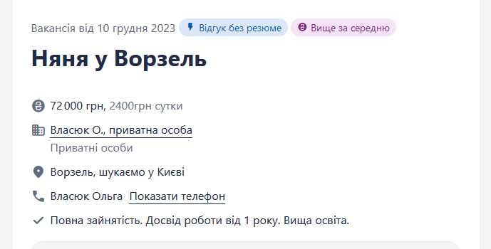 В другом сообщении приглашают на работу няню в семью по уходу за тремя детьми с возможностью выезда за границу.