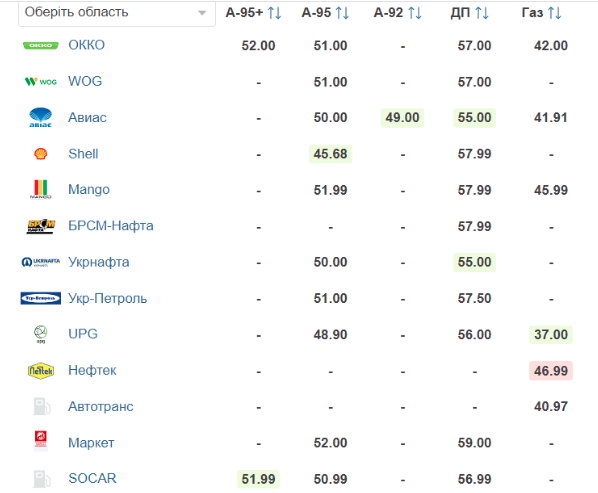 Самую низкую цену на бензин категории А-95 предлагают АЗС Shell (45,68 грн/л), UPG (48,90 грн/л), Укрнафта и Авиас (50 грн/л).