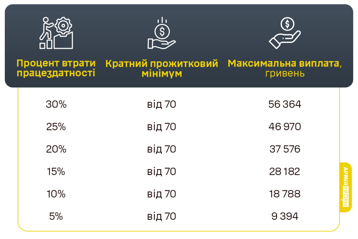 Единовременное пособие выплачивается в зависимости от степени потери трудоспособности, которую должна установить медико-социальная экспертная комиссия в процентах для военных, кроме срочной службы: от 70-кратного прожиточного минимума, утвержденного законом для трудоспособных лиц на начало января календарного года, когда впервые установили степень потери трудоспособности, если ранение или увечье, заболевания - связанные со службой, а также лицу, уволенному со службы, частично потерявшему трудоспособность по указанной причине, но не позднее чем через три месяца после увольнения со службы.