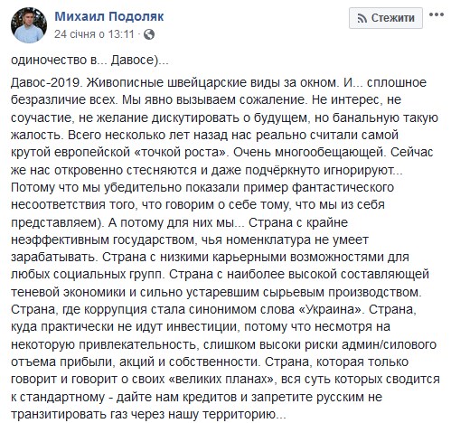 "Украина дважды так и не изменила свое внутреннее устройство и не отказалась от коррупционной модели управления, несмотря на максимальную поддержку внешних партнеров. Особенно раздражает постоянное фанфаронство с рассказами о "нашем неслыханном величии", при том что сухие стат/цифры говорят о глубоком кризисе. Давос - сплошная печаль в глазах немногих наших партнеров. Потому что ничего не будет. Никаких крутых прорывных идей и никаких нацпроектов. Мы ведь только, чтобы потрепаться...", - написал Подоляк.