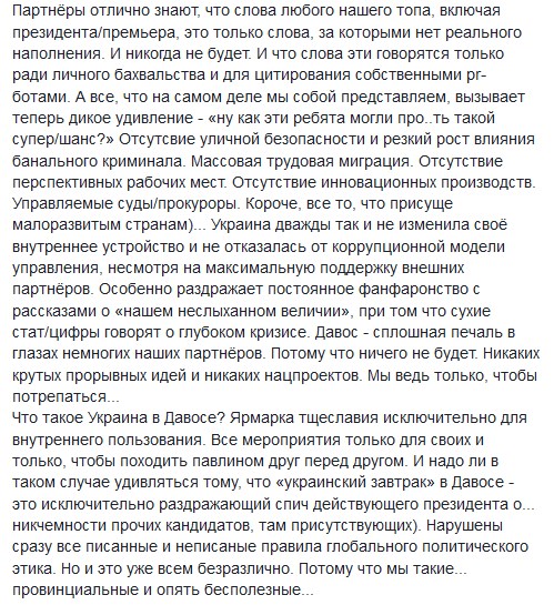 "Все мероприятия только для своих и только, чтобы походить павлином друг перед другом. И надо ли в таком случае удивляться тому, что "украинский завтрак" в Давосе - это исключительно раздражающий спич действующего президента о... никчемности прочих кандидатов, там присутствующих. Нарушены сразу все писанные и неписаные правила глобального политического этика. Но и это уже всем безразлично. Потому что мы такие... провинциальные и опять бесполезные...", - резюмировал он.