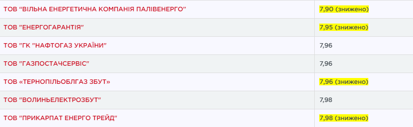 В частности цену снизят ООО "Свободная энергетическая компания Топливэнерго", ООО "Энергогарантия", ООО "Тернопольоблгаз сбыт" и ООО "Прикарпат Энерго Трейд".