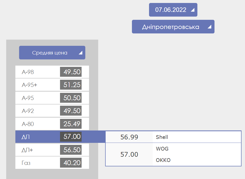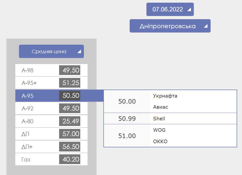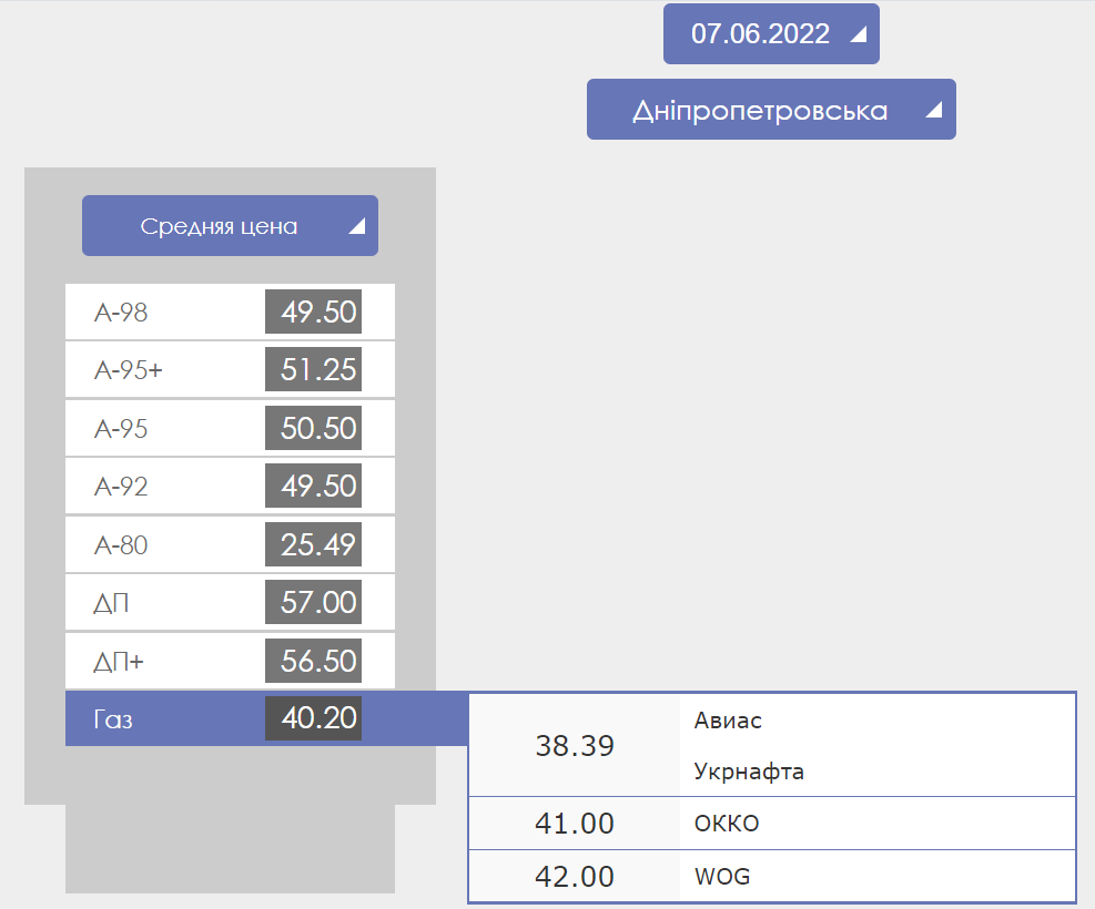 В Днепропетровской области предлагают купить бензин А-95 по цене 50-51 грн, дизельное топливо продают по 57 грн, а автогаз - от 39,39 до 42 грн.