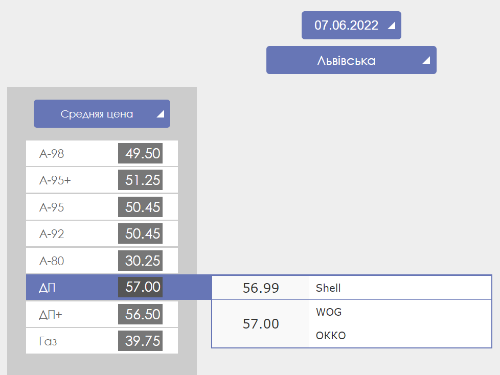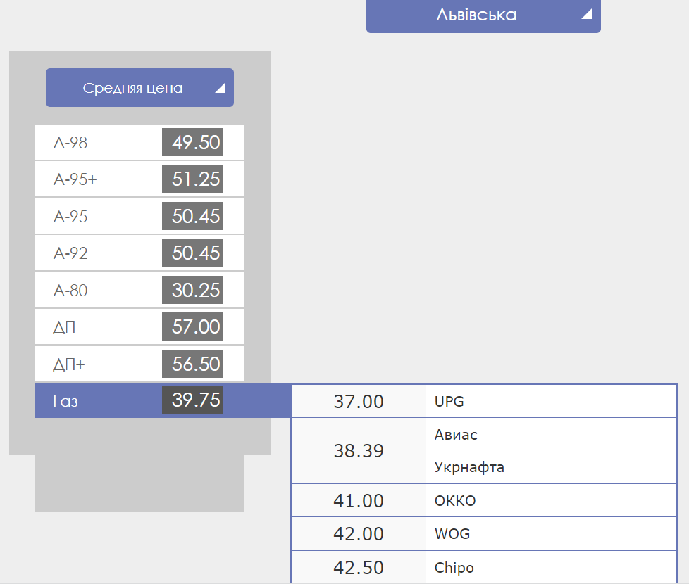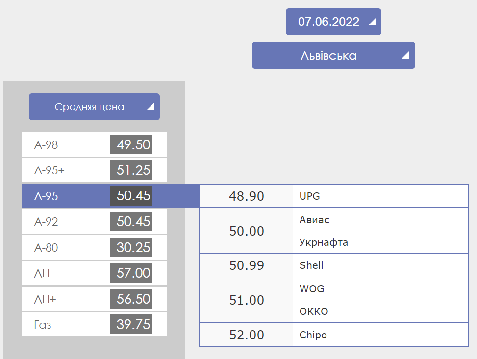 Во Львовской области можно заправится бензином А-95 по цене 48,90-52 грн, дизельным топливом - по 57 гривен. Стоимость автогаза составляет от 37 до 42,50 гривен.