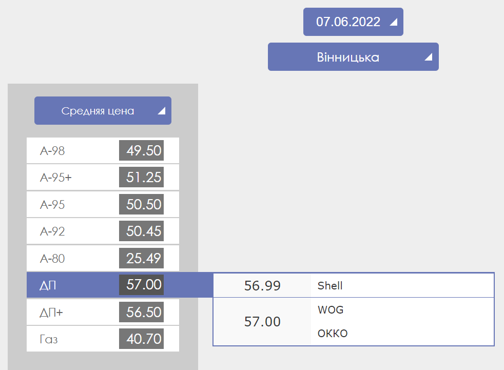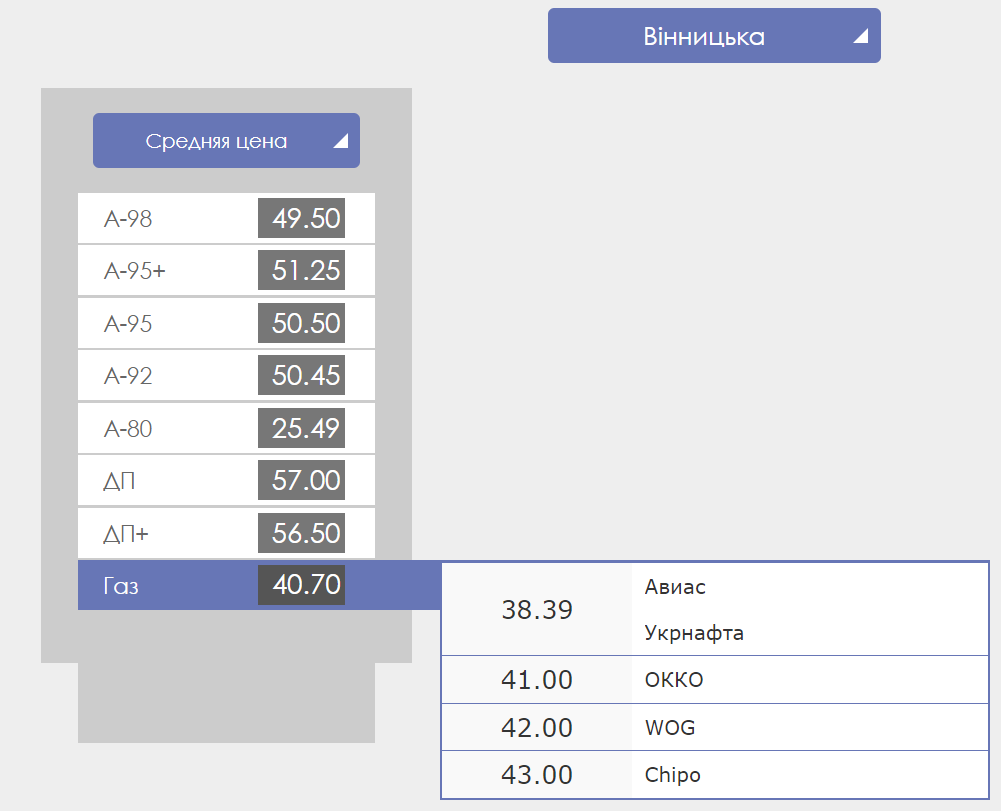 Так, в Винницкой области цена на бензин А-95 колеблется в пределах 50-51 грн, дизельное топливо стоит - 57 грн, а автогаз можно купить по цене от 39,39 до 43 грн.