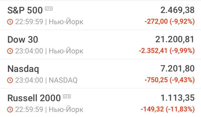Индекс Dow Jones снизился на 2075,96 пунктов , до 21 477,26 пункта (-8,81%), индекс S&P 500 - на 223,81 пунктов, до 2 517,57 пункта (-8,16%), а индекс Nasdaq Composite - на 635,56 пунктов, до 7 316,49 (-7,99%).