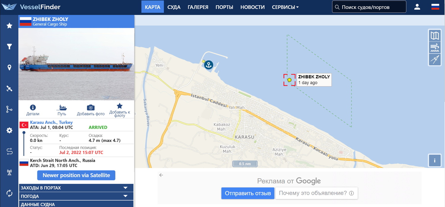 По данным журналистов, грузовое судно "Жибек жолы" стоит на якоре примерно в 1 км от берега и за пределами порта Карасу. Об этом также свидетельствуют данные сайта vesselfinder.com - данный ресурс занимается мониторингом передвижения кораблей.