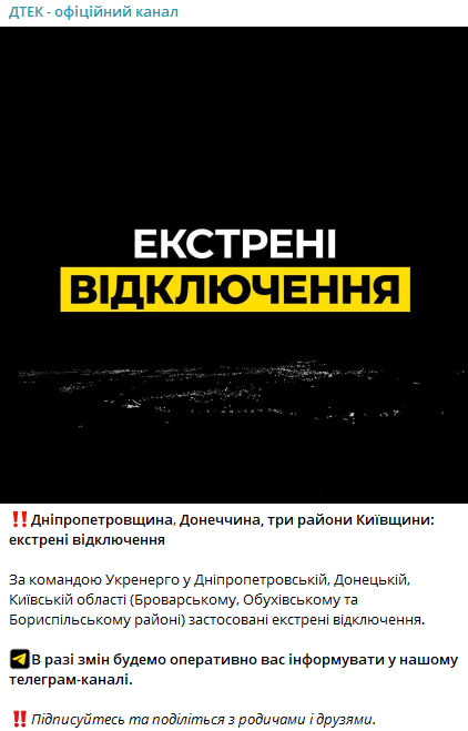 По данным ДТЭК, по указанию Укрэнерго в Днепропетровской, Донецкой, Киевской области (Броварском, Обуховском и Бориспольском районах) применили экстренные отключения.