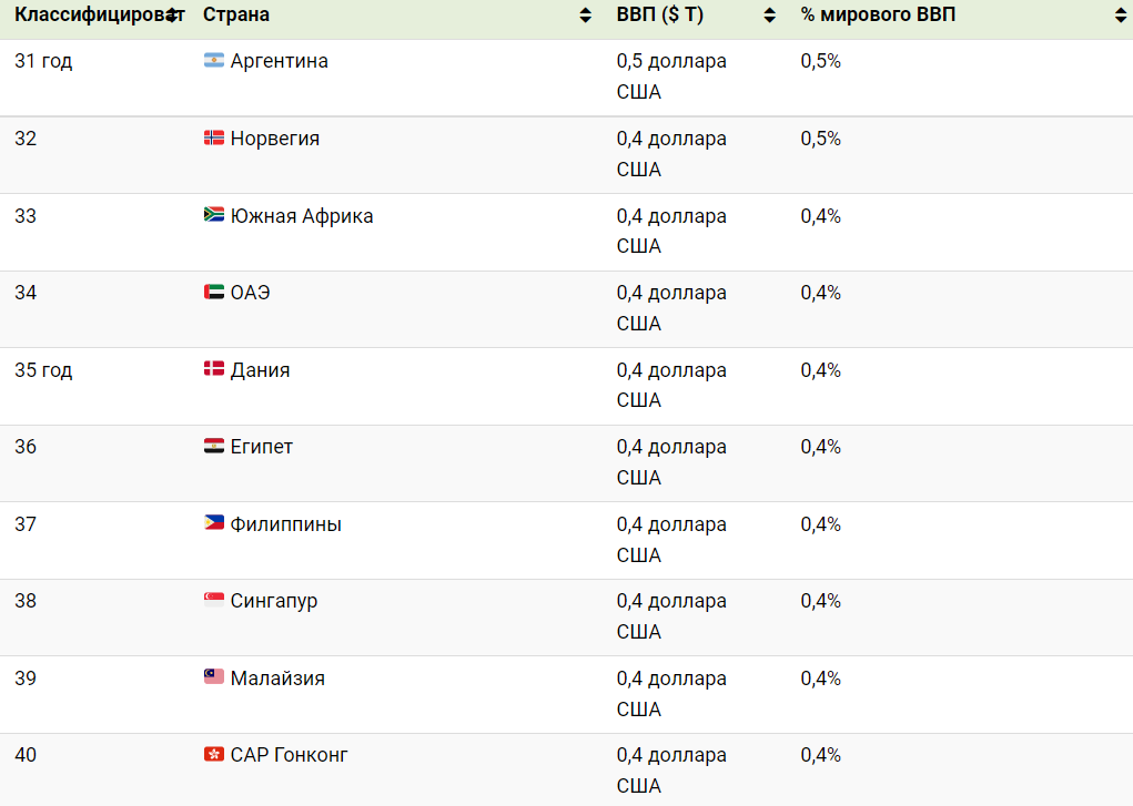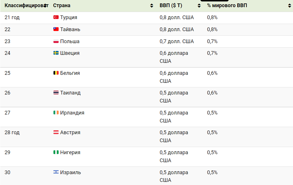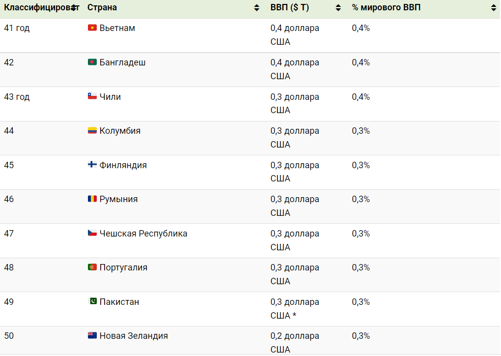 В ТОП-50 стран с наибольшим показателем ВВП вошли: США, Китай, Япония, Германия, Великобритания, Индия, Франция, Италия, Канада, Корея, Россия, Бразилия, Австралия, Испания, Мексика, Индонезия, Иран, Нидерланды, Саудовская Аравия, Швейцария, Турция, Тайвань, Польша, Швеция, Бельгия, Таиланд, Ирландия, Австрия, Нигерия, Израиль, Аргентина, Норвегия, Южная Африка, ОАЭ, Дания, Египет, Филиппины, Сингапур, Малайзия, Гонконг, Вьетнам, Бангладеш, Чили, Колумбия, Финляндия, Румыния, Чешская Республика, Португалия, Пакистан, Новая Зеландия.