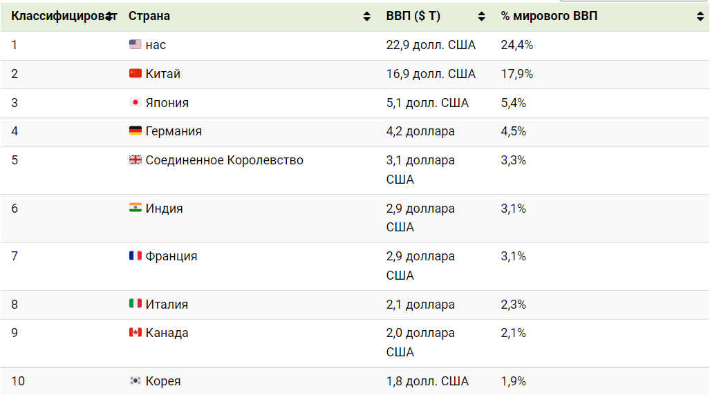 Так, в 2021 году, по данным и оценкам Международного валютного фонда (МВФ), только в номинальном выражении, лидерами по валовому внутреннему продукту стали четыре страны - США, Китай, Япония и Германия. Фактически, только ВВП США превышает совокупный ВВП 170 стран.