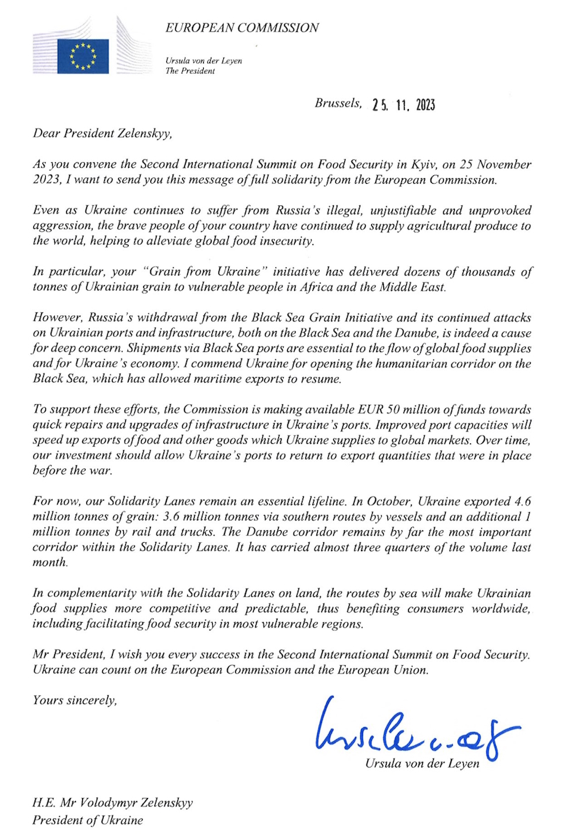 "Со временем наши инвестиции позволят портам Украины вернуться к довоенным объемам экспорта. Вдобавок к "путям солидарности" на суше, морские маршруты сделают украинский пищевой экспорт более конкурентоспособным и предполагаемым, что пойдет на пользу потребителям во всем мире, в том числе через содействие пищевой безопасности в наиболее уязвимых регионах", – говорится в письме.