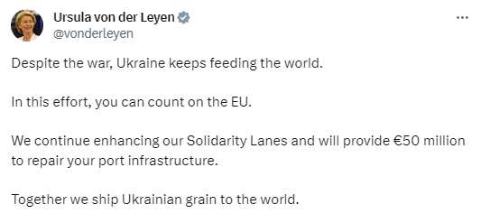 "И в этих усилиях вы можете рассчитывать на ЕС. Мы продолжаем совершенствовать наши "пути солидарности" и предоставим €50 миллионов на ремонт вашей портовой инфраструктуры. Вместе мы везем украинское зерно в мир", - отметила политик.