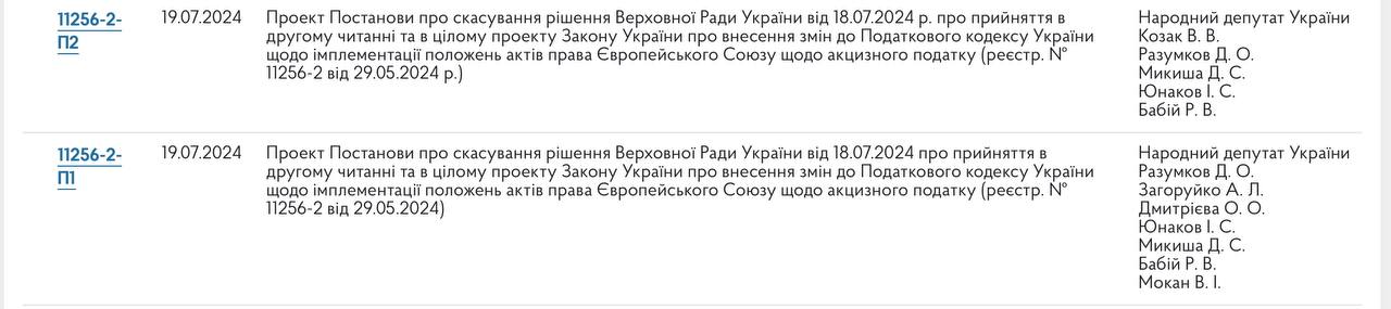 В Верховной раде зарегистрировали два проекта постановления об отмене решения о принятии во втором чтении законопроекта №11256-2, предусматривающего повышение акцизного налога на топливо. Соответствующий документ был принят 18 июля.