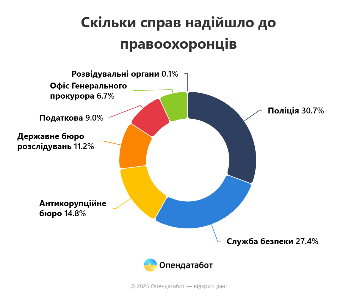 "Больше всего материалов поступает в Национальную полицию - 31% (323 дела). Еще 27% или 289 материалов - в СБУ и 15% или 156 материалов - в НАБУ. Суммарно все эти дела оценивают в 37,39 млрд грн. Меньше материалов поступило в Офис генпрокурора - 7% (7%), а один материал направили в разведку", - говорится в сообщении.