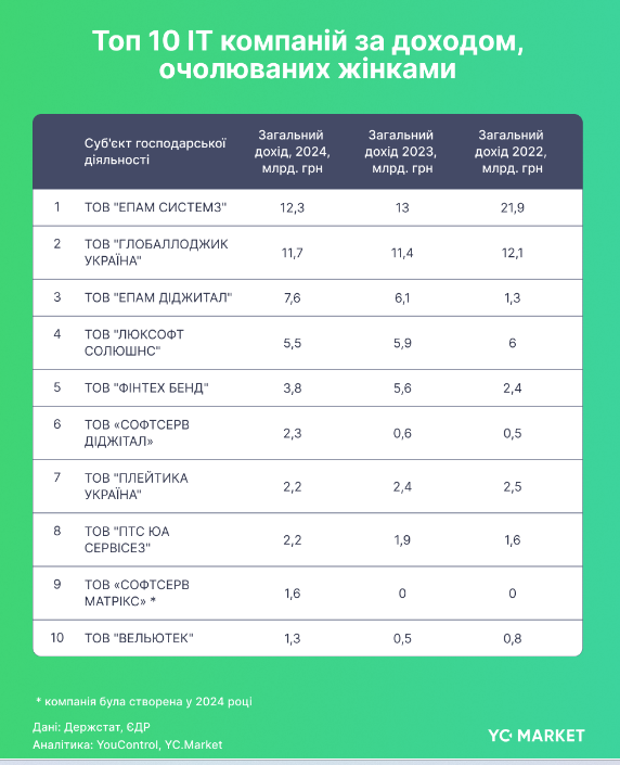 В топ-10 компаний по доходам 2022-2024 годов, которые возглавляют женщины, попали такие игроки IT-рынка, как EPAM, GlobalLogic, SoftServe, Luxoft.