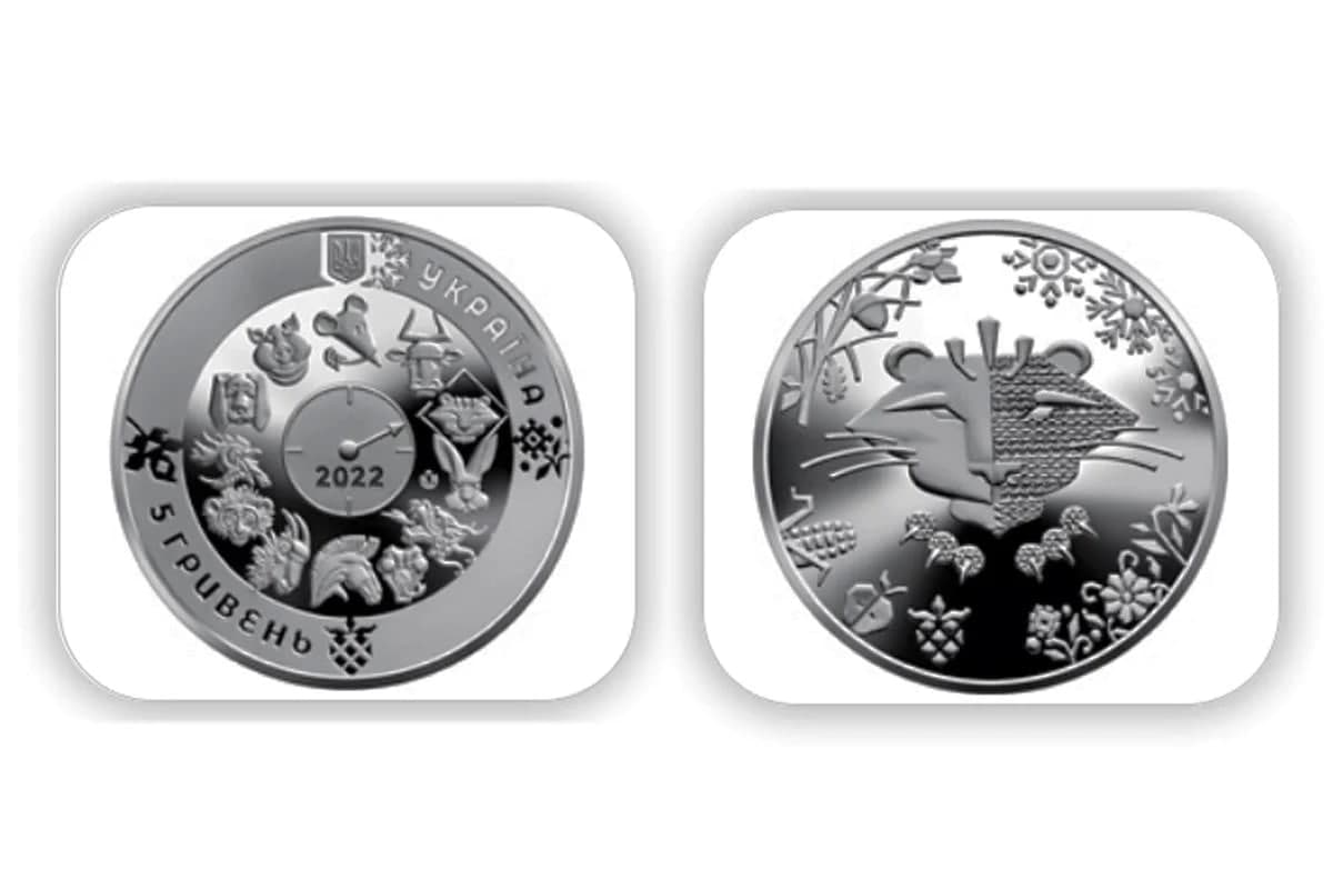 На аверсе монеты размещено: вверху – малый Государственный Герб Украины, справа от которого надпись полукругом УКРАИНА; на зеркальном фоне по кругу изображены 12 символов восточного календаря, в центре круга – стилизованные часы со стрелкой, указывающие на тигра – символ года, под стрелкой – 2022; внизу слева надпись полукругом 5 ГРИВЕН; на матовом фоне изображены стилизованные под украинскую витинанку символы каждого времени года: снежинка (вверху), цветок (справа), ягода (внизу), листок (слева); логотип Банкнотно-монетного двора Национального банка Украины (слева от символа кролика).