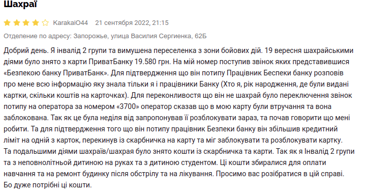 "Для убедительности, что он не жулик, было переключение звонка на оператора с номером "3700". Оператор сказал, что в мою карту были вмешательства и она заблокирована. Он предложил ее разблокировать сейчас и начал говорить, что мне делать. Он увеличил кредитный лимит на одной из карточек, перекинул с копилки на карту, и мог заблокировать или разблокировать карту. Следующими действиями мошенников были сняты средства с копилки и карты в размере 19580 гривен" , - продолжила женщина в своем отзыве.