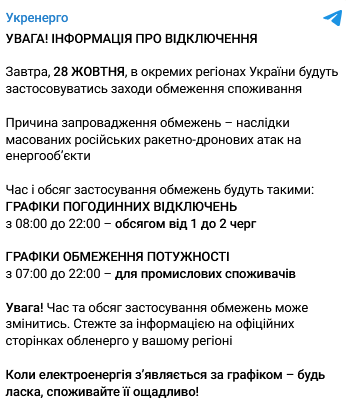 "Завтра, 28 октября, в отдельных регионах Украины будут применяться меры по ограничению потребления", – сообщают в компании.