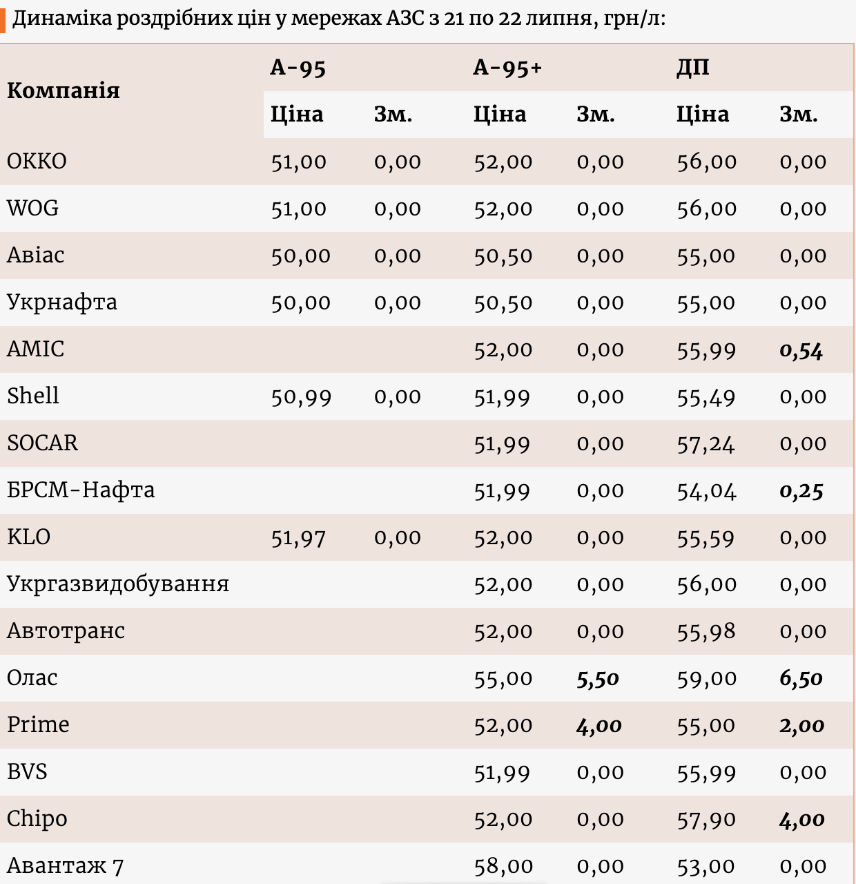 Кроме того, в ровенской сети Олас, насчитывающей 10 АЗС, на 5,5 и 6,5 грн. до 55 и 59 грн./л подорожали бензин и дизельное топливо соответственно. Еще одна локальная сеть Катрал (9 АЗС) прибавила 6 грн к цене бензина, то есть сейчас он стоит 60,99 грн/л и увеличила цену ДТ до 58,99 грн/л (плюс 3,99 грн).