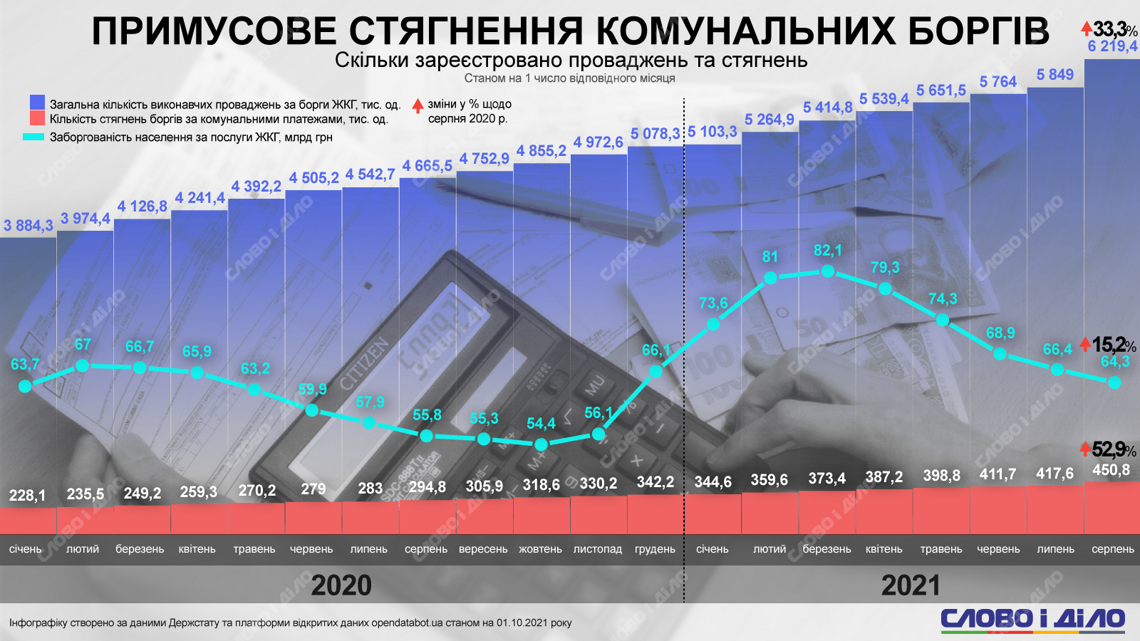 До конца года долги за коммуналку увеличились до 66,1 млрд грн. Исполнительных дел насчитывалось 5 млн 78,3 тысячи, а количество взысканий составило 342,2 тысячи.