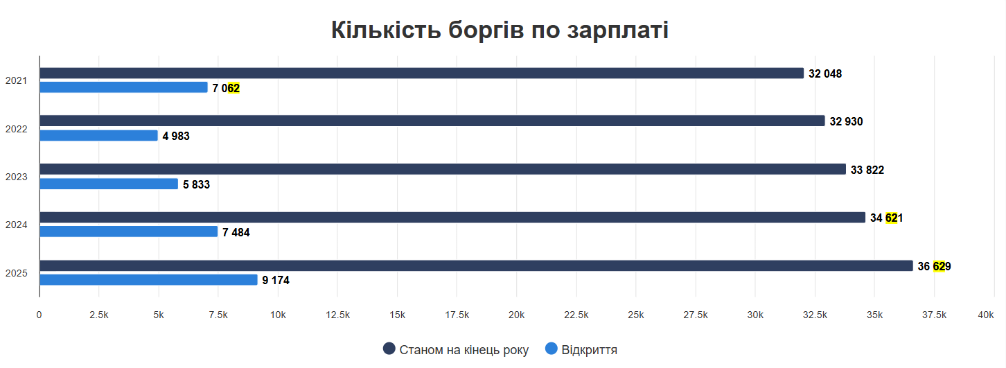 В Украине на начало 2026 года зафиксировано более 36,6 тысячи активных производств по задолженности по заработной плате. В течение 2025 года было открыто 9 174 новых дела, что стало самым большим показателем за последние пять лет. Самая сложная ситуация наблюдается в промышленных секторах и в Днепропетровской области, где сосредоточено более трети всех долговых случаев.