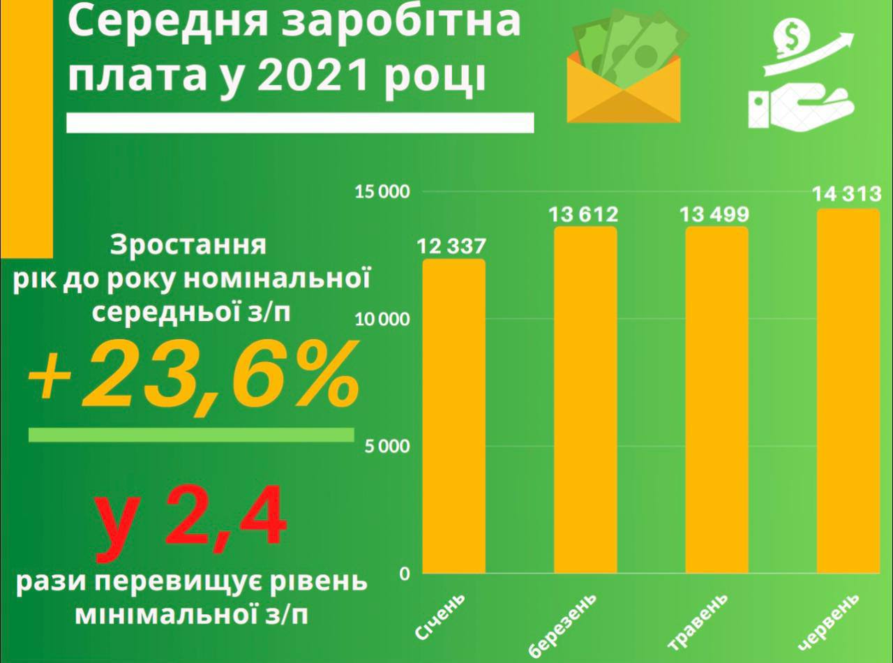 Размер средней номинальной заработной платы в июне 2021 года в Украине составил 14 313 грн, это в 2,4 раза выше уровня минимальной заработной платы, которая составляет 6 000 грн.