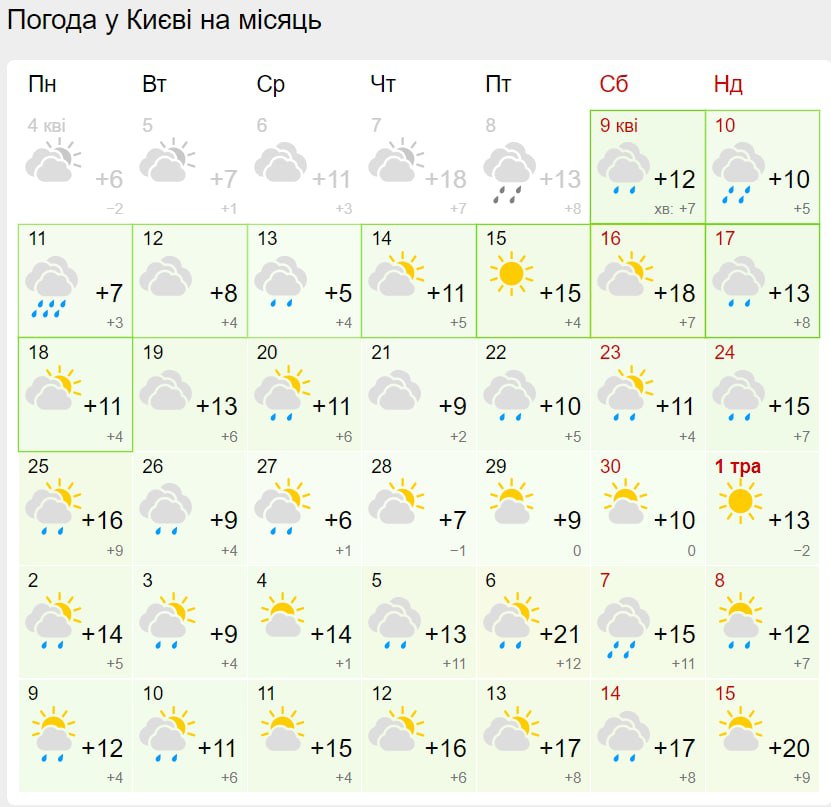 Что касается температур, то весна постепенно будет вступать в свои права и после 1 мая в Киеве уже не прогнозируются "минуса" даже в ночные часы. 4 мая еще будет +1, но к середине месяца ночи станут теплее, хотя в целом потепление будет нестабильным. После 21 градуса тепла 6 мая уже 7 числа похолодает до 15 градусов. Так что жителям столицы стоит быть готовыми к температурным качелям.